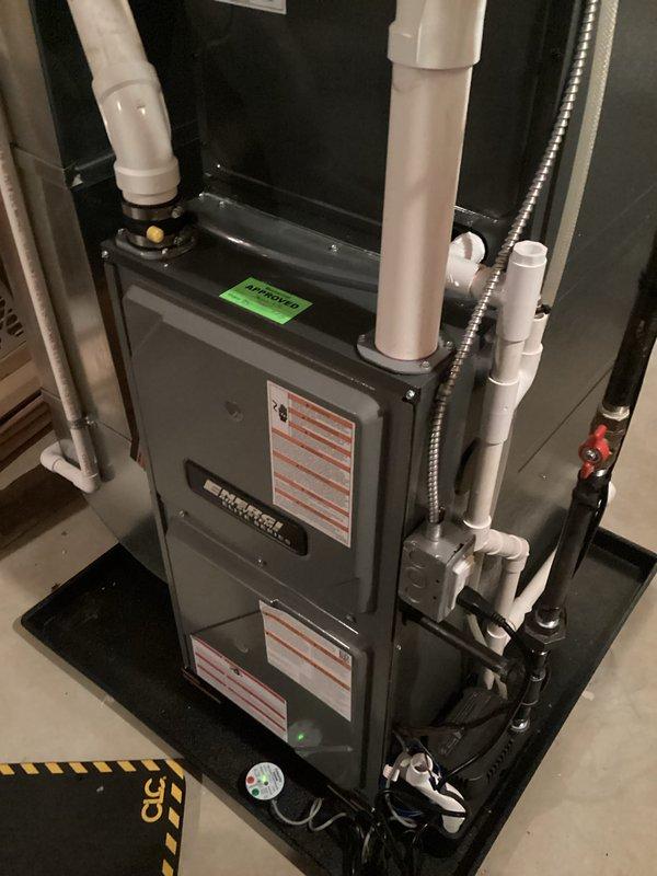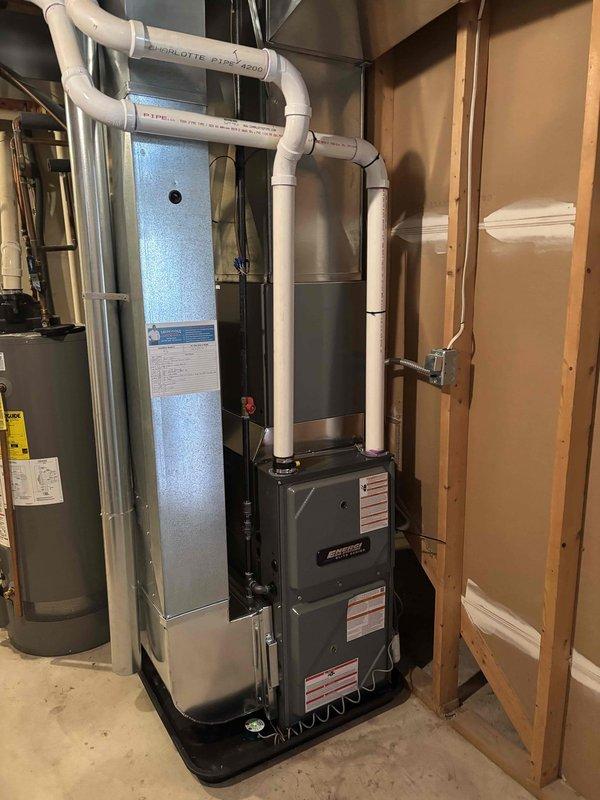 Successfully installed new furnace in basement utility area with proper PVC intake/exhaust venting connected to existing ductwork system. Unit was properly positioned with all connections secured and tested for optimal operation. Installation completed with all safety protocols followed and system functioning as designed.