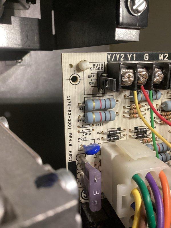 Performed annual heating maintenance on 20-year-old furnace. Inspected control board (1170-83-3001 REV.B) with AUTO STAGE switch and terminal connections (Y/Y2, Y1, G, W2). All wire connections and components appear in good condition with no visible damage or deterioration.