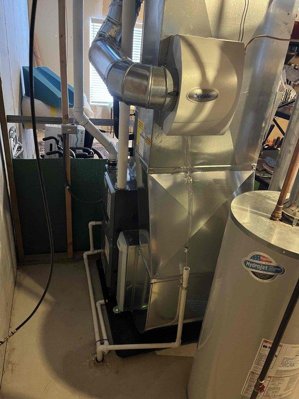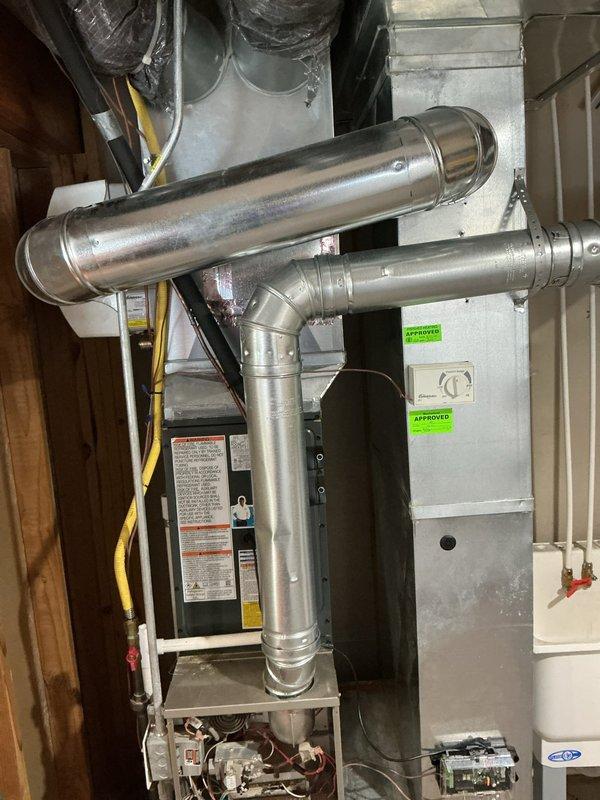 Successfully completed installation of new Aprilaire furnace system with proper ductwork connections and exhaust venting. System was integrated with existing HydroJet water heater and all necessary PVC piping was installed according to manufacturer specifications.