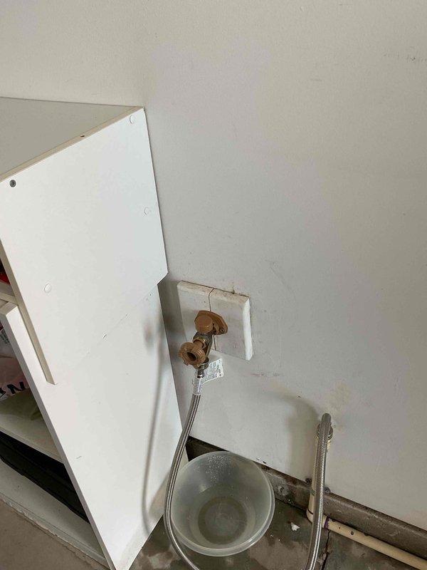 Responded to service call for leaking garage spigot. Inspected the area and found water accumulation in catch bucket below brass shutoff valves. Repaired leaking connection at water supply lines and verified proper operation with no further leakage.