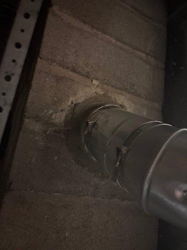 Installed 4x35 liner through concrete block wall foundation. Verified proper connection and sealing at penetration point. Documented installation with photos showing completed duct penetration and support bracket placement.