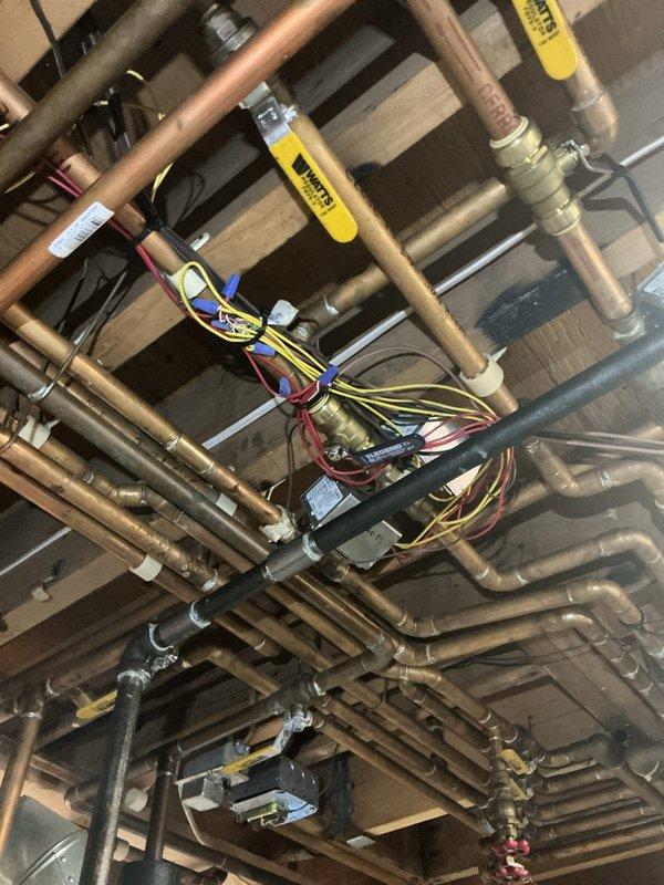 Completed annual heating maintenance on dual heating system consisting of forced air furnace and boiler. Performed comprehensive tune-up on EnergiAir furnace unit (2011 model, 11 years in service), including filter inspection, burner cleaning, heat exchanger examination, and safety control testing. Inspected boiler system and associated hydronic piping network, verified proper operation of circulator pumps, checked pressure relief valves, and confirmed adequate system pressure. Documented existing mechanical room configuration showing extensive copper piping distribution system with multiple zones and integrated electrical controls. All equipment operating within normal parameters at time of service completion.