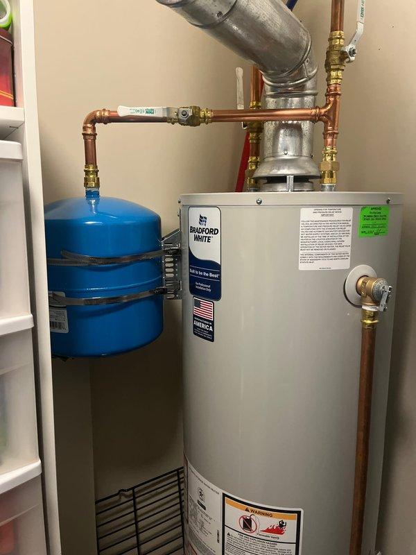 Responded to emergency service call for Bradford White water heater exhibiting leakage and alarm activation. Diagnosed issue and successfully deactivated alarm system. Installation appears in good condition with proper copper piping, brass fittings, and expansion tank secured with metal strapping.