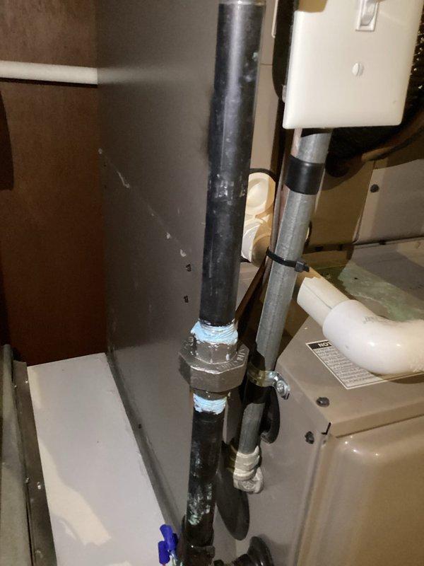 Responded to inspector correction regarding gas leak at union fitting in basement. Located and repaired leaking connection at hexagonal union fitting on gas line. Performed soap bubble test to verify leak elimination and documented repair with photographic evidence for inspector verification.