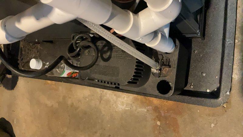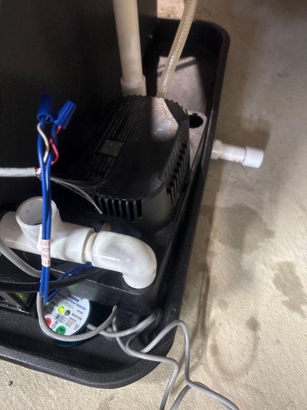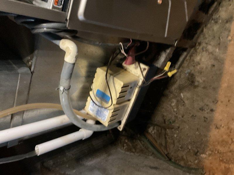 Completed annual cooling system maintenance and inspection on 2012 air conditioning unit. Performed standard tune-up procedures including filter check, refrigerant level verification, electrical connections inspection, and condenser coil cleaning. Inspected condensate pump assembly and drainage system in utility area, noting proper operation of pump mechanism with multiple PVC discharge lines and functioning electrical connections. All components operating within normal parameters at time of service.