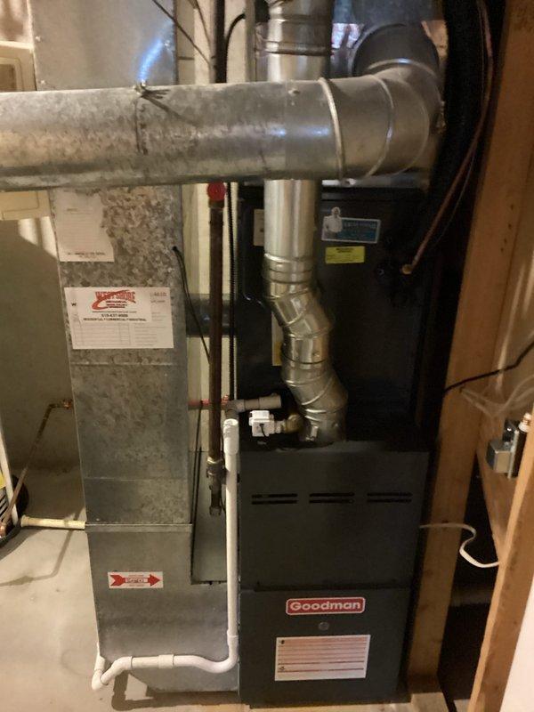 Completed annual heating maintenance on 6-year-old Goodman furnace system with integrated humidifier. Performed comprehensive tune-up including filter inspection, burner assembly cleaning, heat exchanger examination, blower motor lubrication, and safety control testing. Verified proper operation of humidifier system, checked ductwork connections for air leaks, and confirmed condensate drainage system functioning correctly. All components operating within manufacturer specifications with no deficiencies noted.