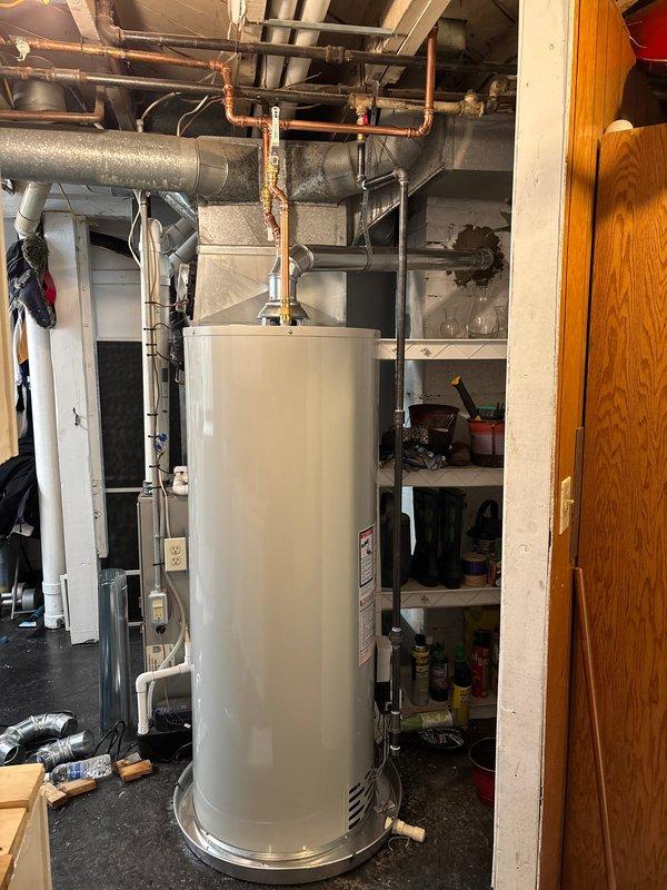 Completed full water heater replacement in basement utility room. Removed existing unit and installed new tall cylindrical water heater, connecting to existing copper supply lines and ensuring proper venting through adjacent ductwork. Verified all connections for leaks, tested unit operation, and confirmed proper functionality before completing installation.