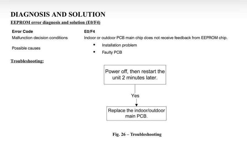 Responded to no cooling complaint on mini-split system. Previous electrical power supply issues had been corrected by electrician prior to arrival. Upon diagnostic evaluation, unit displayed EEPROM error code (E0/F4) indicating communication failure between PCB main chip and EEPROM chip. Following manufacturer troubleshooting protocol, performed power cycle procedure and determined indoor/outdoor main PCB replacement was required to restore system operation.