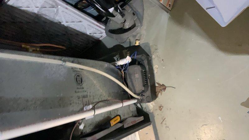Responded to water leak service call for 15-year-old furnace condensation pump. Upon inspection, confirmed pump was actively leaking while heating system remained operational. Documented existing conditions showing significant corrosion on copper fittings and water staining on concrete floor around pump unit. Photographed condensate pump assembly, associated plumbing connections, and orange PVC discharge piping for service records. Given the age of the pump and active leak condition, recommended pump replacement to prevent further water damage and ensure reliable condensate removal from furnace operation.