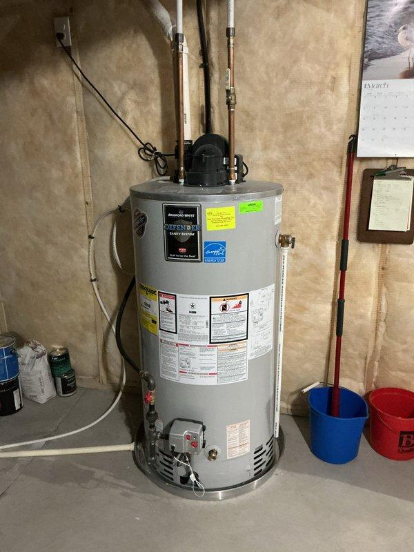 Successfully installed a Bradford White 40-gallon natural gas water heater, model RG240U6N, in the basement utility area. Connected copper supply lines and gas piping to the unit with proper brass fittings and valves, ensuring all connections were secure and leak-free. Verified proper venting configuration for Category I natural draft operation and confirmed all manufacturer specifications including 40,000 BTU/hr input rating and 150 psi working pressure were met per installation requirements.