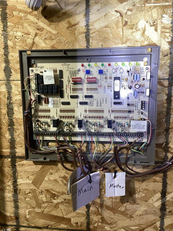 Replaced Honeywell control panel with new unit. Installed two circuit boards containing control relays, terminals, and indicator lights into wall-mounted enclosure. Terminated and labeled all system wiring, including main and master circuit connections, ensuring proper integration with existing HVAC building management system.