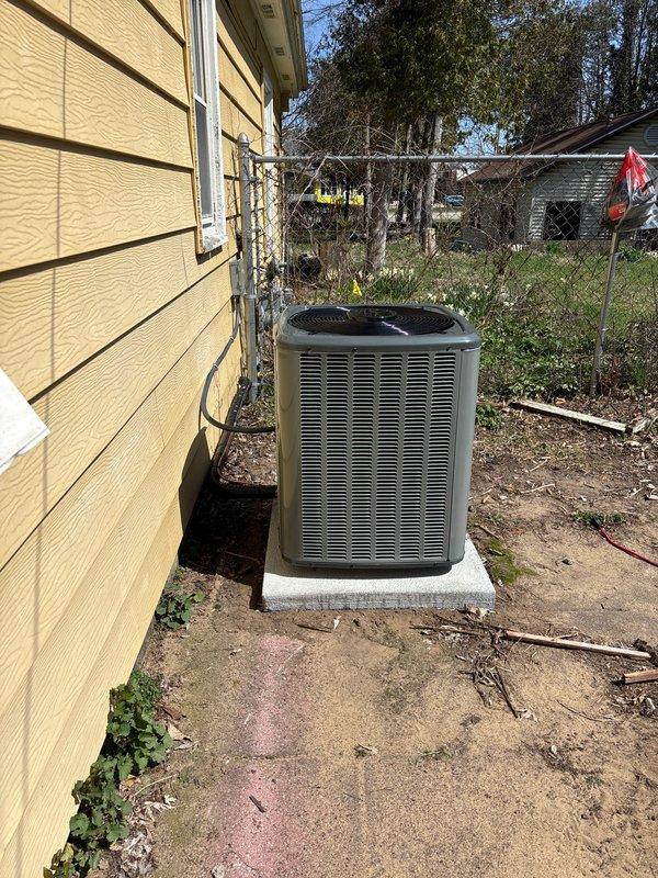 Completed full installation of new furnace and air conditioning system. The outdoor condensing unit was positioned on a concrete pad adjacent to the residence with proper electrical conduit routing along the exterior wall. All equipment was tested and verified operational upon completion of the installation.
