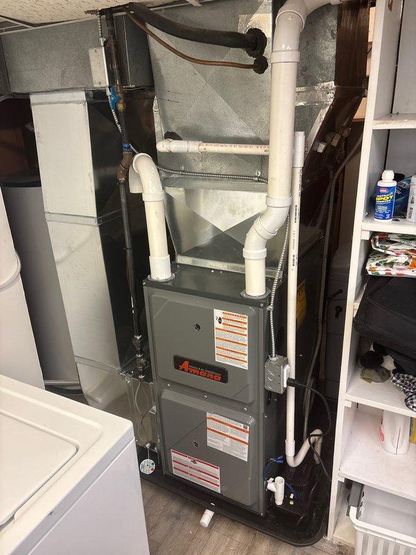 Successfully installed new Amana furnace system with proper PVC ventilation and connections to existing ductwork. Unit was properly mounted in utility room with all safety labels visible and accessible. System was tested and verified to be functioning correctly.