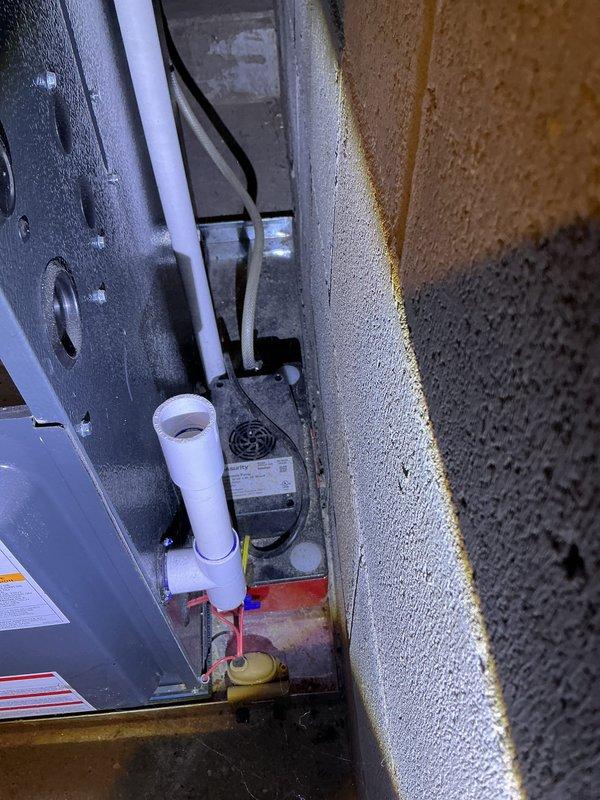 Completed annual heating maintenance on customer's furnace system. Inspected interior components including condensate collection reservoir, wiring connections, and motor assembly. No humidifier present; system appears to be functioning properly with all components in good working order.