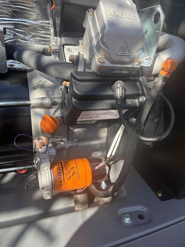 Performed scheduled tune-up service on Generac generator system. Inspected and verified proper installation of oil filter with "GENERAC" marking. All mechanical components, hoses, and electrical connections were examined and found to be in good working condition with no signs of leaks, corrosion, or damage.