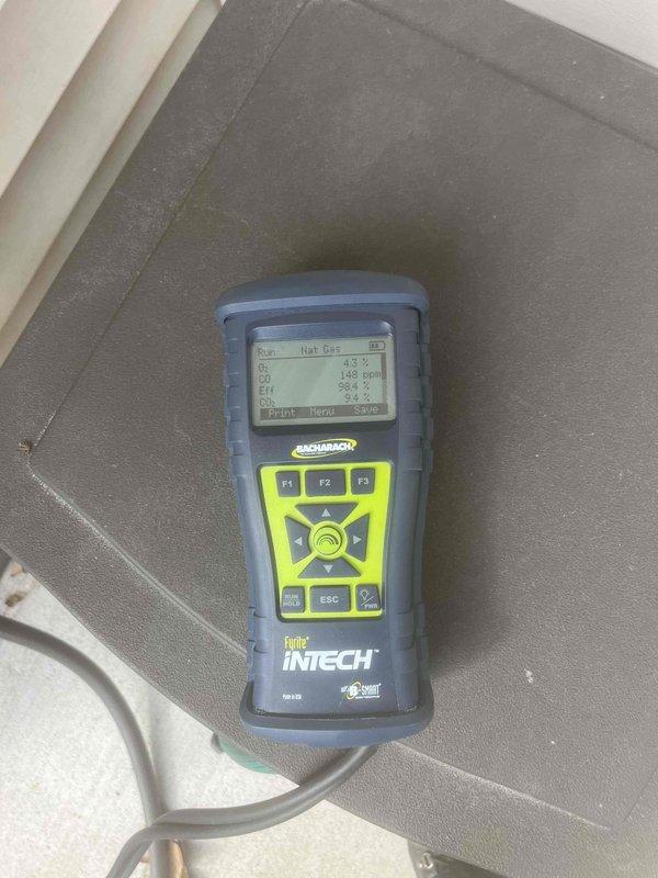Responded to carbon monoxide alarm call and performed diagnostic testing on 11-year-old furnace using Bacharach combustion analyzer. Testing revealed elevated CO levels at 148 ppm, indicating incomplete combustion requiring immediate attention and further system evaluation to ensure safe operation.