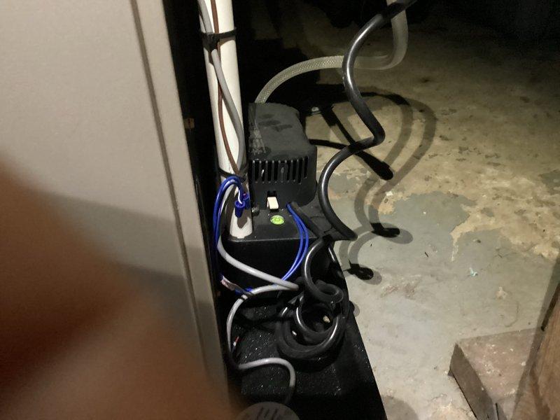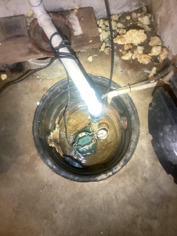Completed sump pump replacement in basement utility area. Removed existing failed unit from basin and installed new sump pump with proper discharge piping, securing all connections and testing operation to ensure proper functionality and automatic cycling.