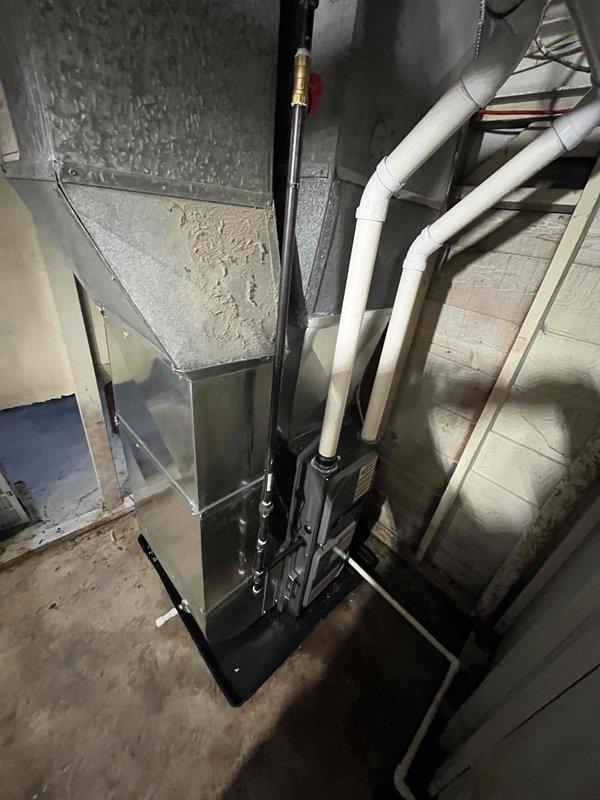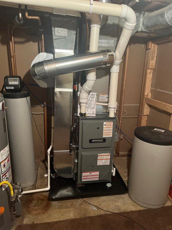 Completed full furnace replacement in basement utility area. Installed new gray metal furnace unit on rubber mat with proper clearances, connected PVC venting system to exhaust/intake pipes routed through ceiling joists, and established all necessary ductwork connections including metallic supply plenum. Verified proper operation of all safety controls, tested ignition sequence, and confirmed adequate airflow throughout system.