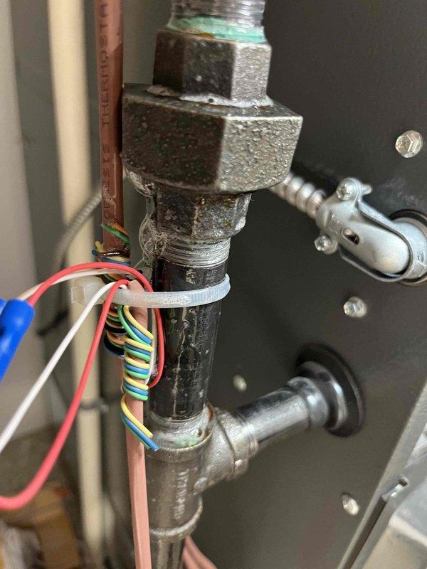 Responded to gas leak call at detached garage housing a 12-year-old Goodman furnace and 1-year-old Rinnai boiler. Upon inspection, identified leak originating from gas pipe union connection at appliance. Tightened hexagonal union fitting and verified secure seal at threaded connections. Performed leak detection test to confirm repair, ensuring safe operation of gas supply lines to both heating units.