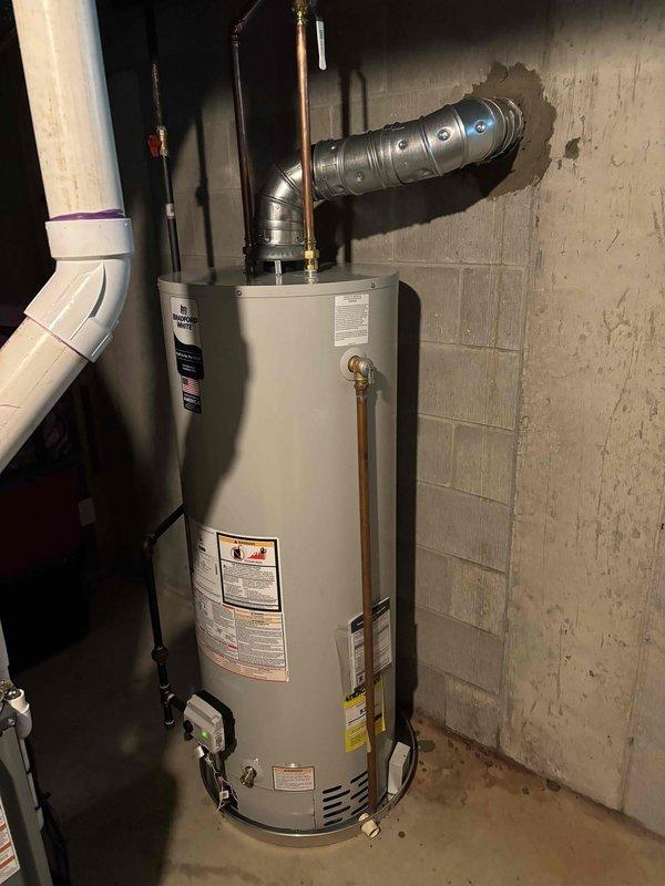 Successfully installed a 50-gallon natural gas water heater in the customer's basement utility area, including proper venting with metal exhaust ducting to the wall. Completed all necessary plumbing connections with copper supply lines and PVC drainage, ensuring all valves and safety features were properly installed and operational.