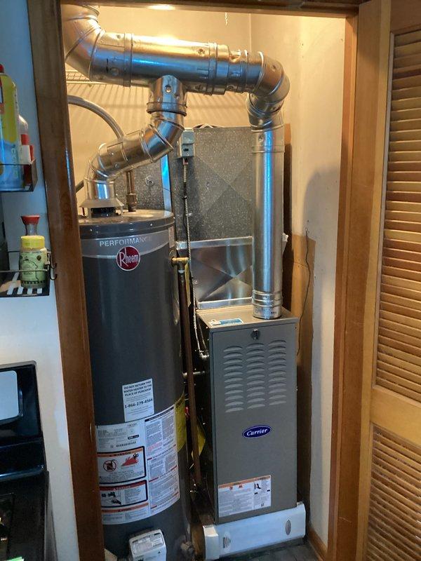 Successfully installed new Carrier furnace unit in residential mechanical room, replacing previous equipment. Installation included connecting unit to existing ductwork and ventilation system, with proper integration alongside the Rheem Performance water heater. All connections were secured and system was verified operational.