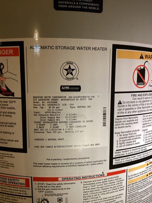 Successfully installed a 40-gallon Bradford White natural draft water heater with AHRI and Energy Star certifications. Completed all connections according to manufacturer specifications and verified proper operation of the unit. Ensured all safety features were functioning correctly and that installation meets current code requirements.
