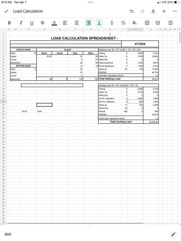 Completed comprehensive estimate for full HVAC system replacement of 27-year-old Carrier furnace and air conditioning unit. Performed detailed load calculations for entire residence, documenting supply runs for all zones and basement distribution, with total heating load calculated at 59,437 BTU and cooling load at 29,051 BTU to properly size replacement equipment.